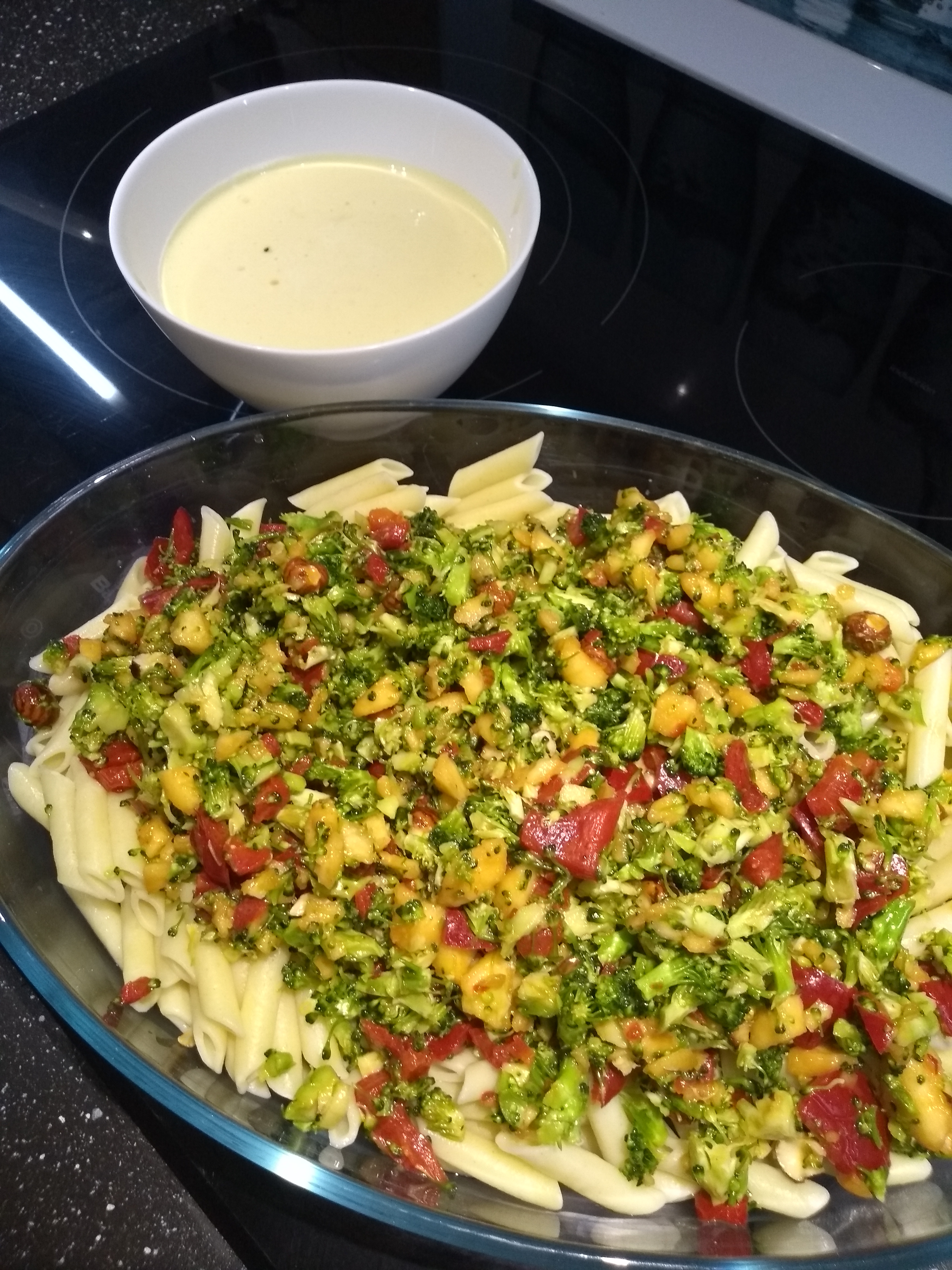 Incorpore la pasta y programe el tiempo que indique el paquete/100°C//vel . Vierta en el recipiente Varoma y refresque la pasta o la quinoa bajo el chorro de agua fría para enfriarla. Reserve.