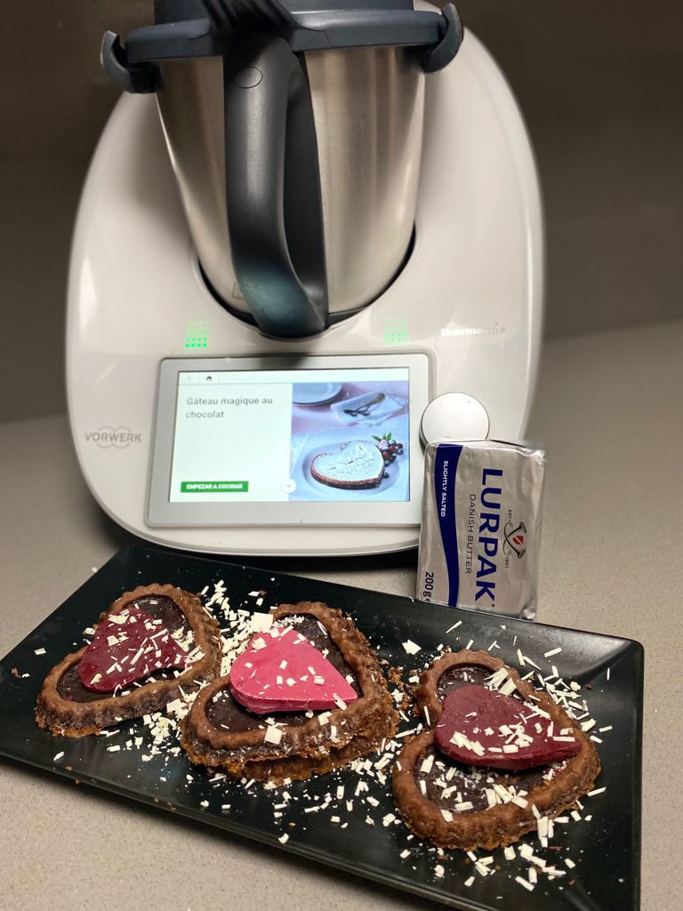 - Con la espátula, baje el chocolate fundido hacia el fondo del vaso, incorpore el chocolate rallado restante y mezcle 2 min/vel 2 (el chocolate ha de quedar a una temperatura de 32°C). Vierta en un molde de silicona y con un cortapastas dales forma , mete en la nevera.