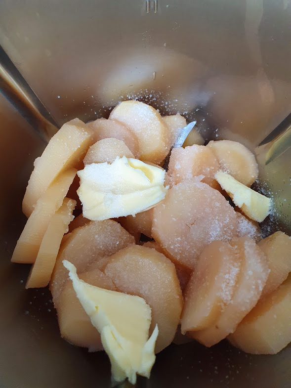 - Vaciar el vaso y poner las patatas, mantequilla, sal , pimienta, y leche y triturar hasta tener la consistencia de una crema , 30seg v.progresiva del 5 al 10.