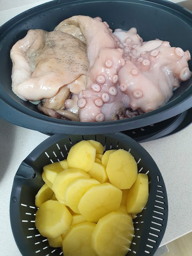La cocción de Pulpo en el recipiente Varoma nos da opción de hacer en el cestillo las patatas.