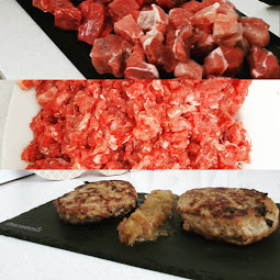 Seguro que se nos han antojado unas hamburguesas caseras muchas veces y no teníamos la carne picada...pues si tenemos carne en trozos para guisar en el congelador, lo tenemos solucionado!! Podemos preparar hamburguesas al gusto picando la carne semicongelada en nuestra thermomix, con solo 10 segundos estará picada. Después podemos añadirle el ingrediente que nos guste, yo hoy un poco de crema de queso y de guarnición una cebolla caramelizada.