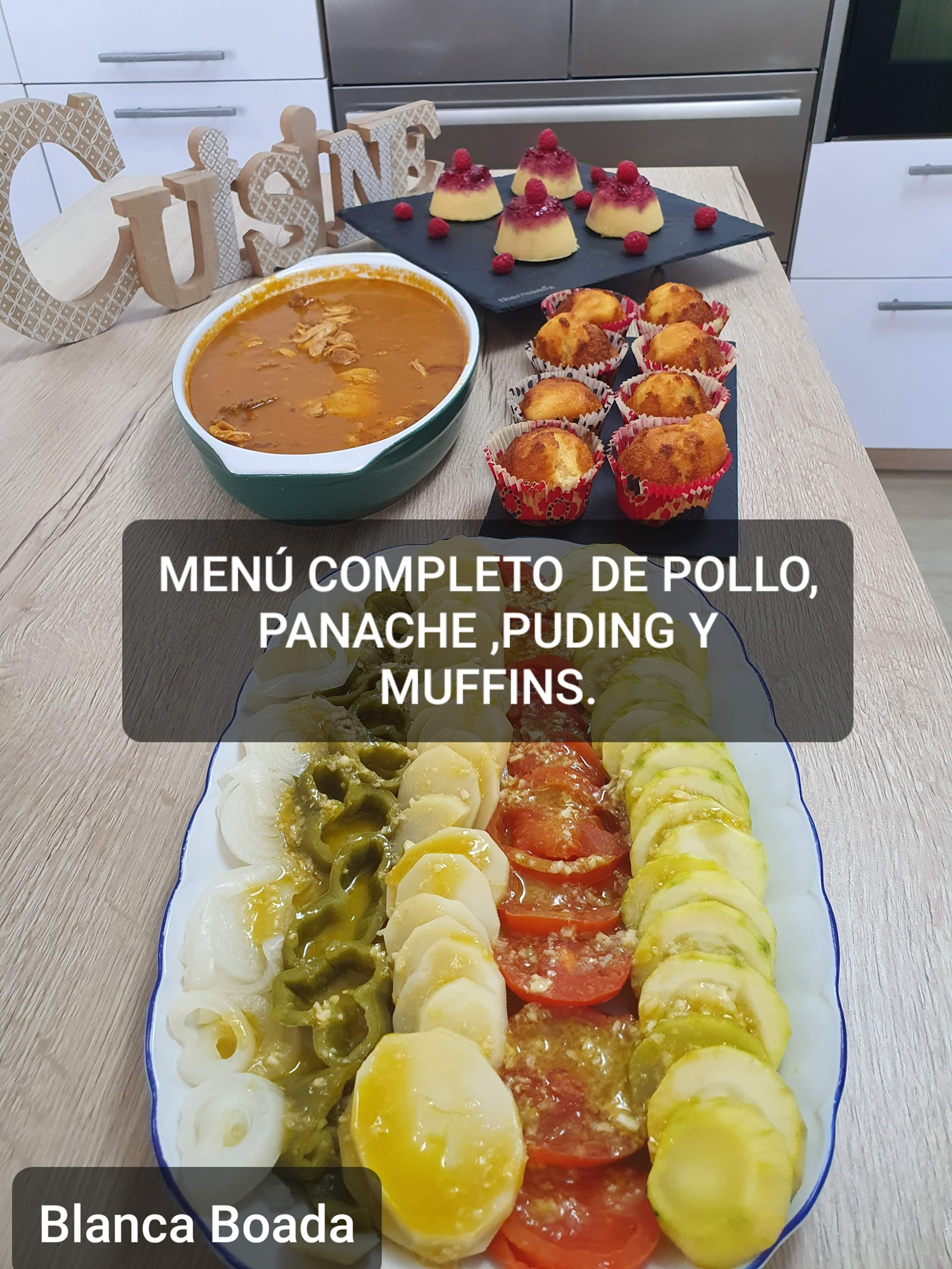 MENÚ COMPLETO DE POLLO EN SALSA COCA COLA , PANACHÉ DE VERDURAS, PUDINS Y MUFFINS.