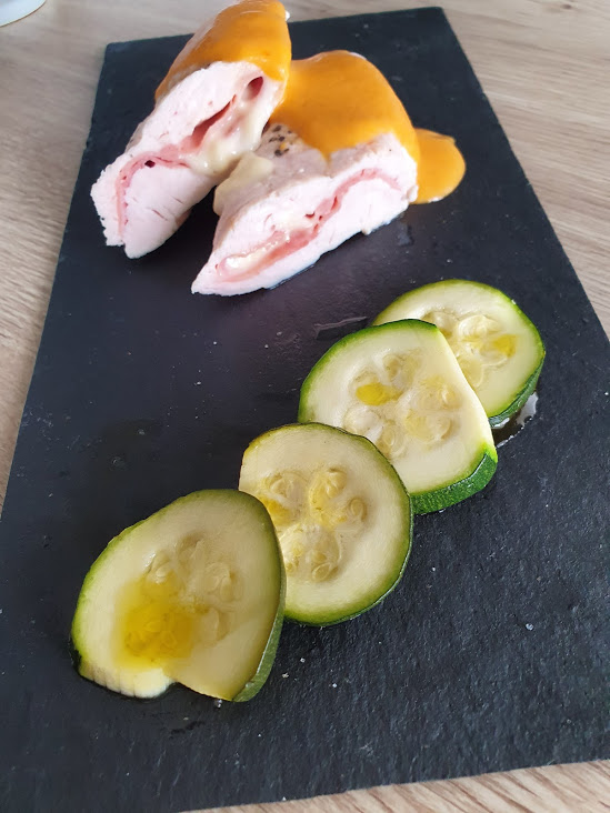 - Preparar las pechugas salpimentadas rellenando con jamón y queso y envolver con film. Colocar en el Varoma . poner debajo la mariposa para ayudar a circular vapor. poner calabacines en rodajas o la verdura que tengáis alrededor de las pechugas.