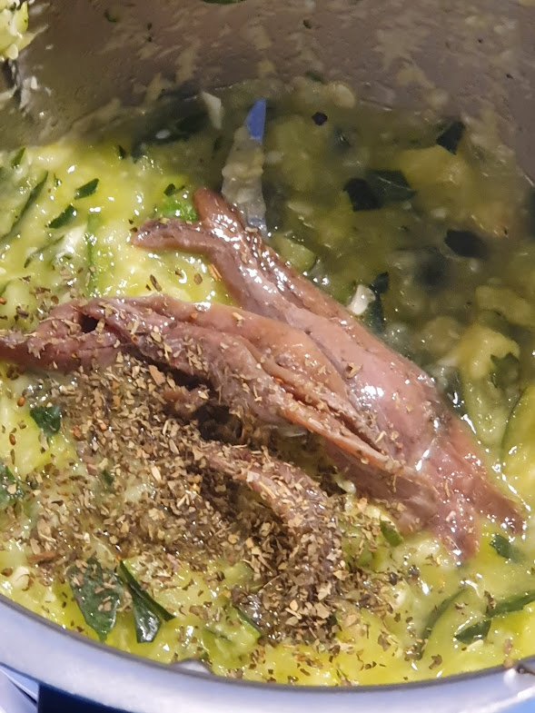 - Incorporamos el calabacín reservado, el tomate, el vino, orégano, sal y pimienta y programamos 20m/120º(varoma)/v.1 giro inverso.