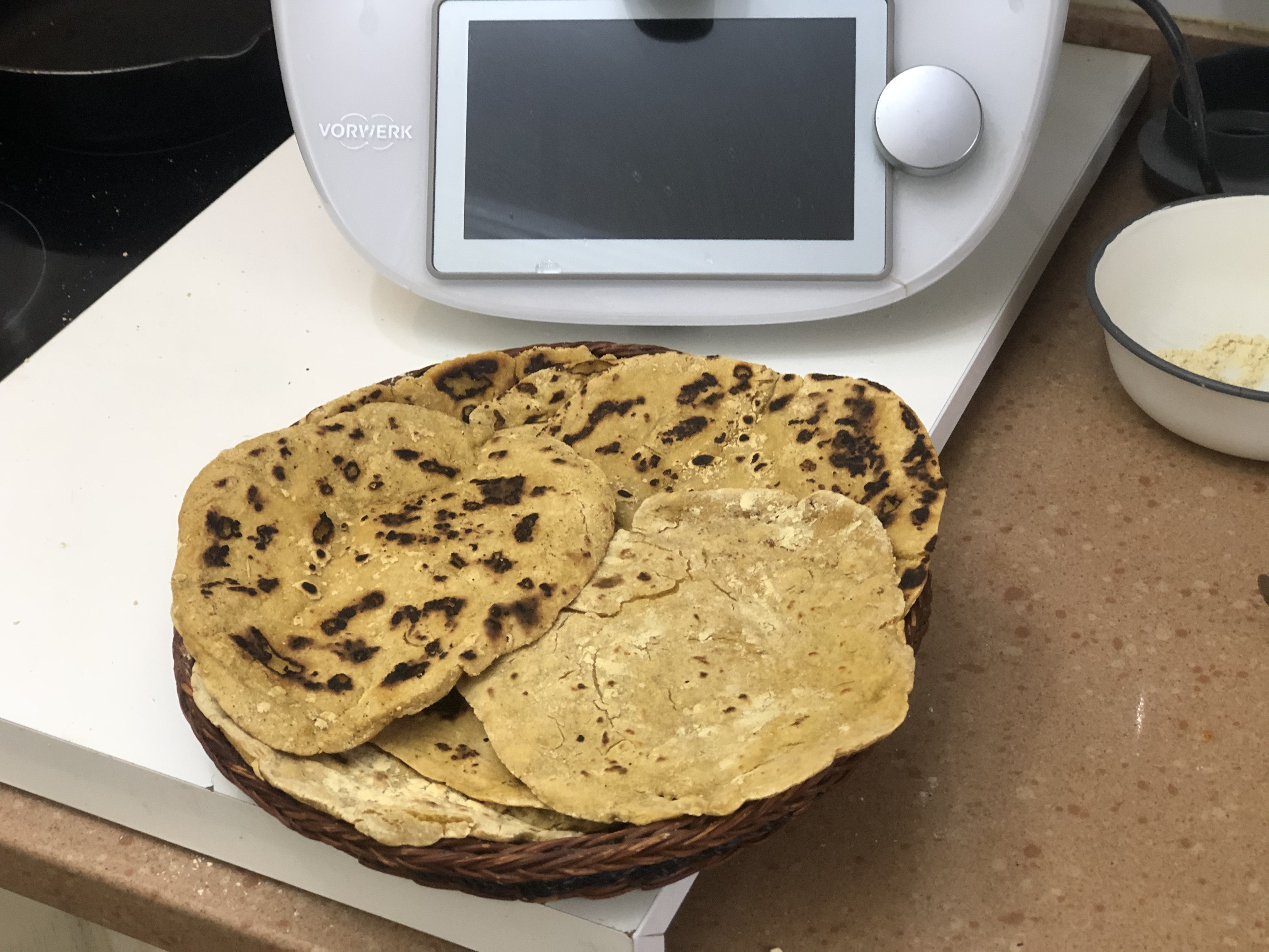 - Sacamos la masa a una encimera enharinada con la harina de maíz y terminamos de amasar