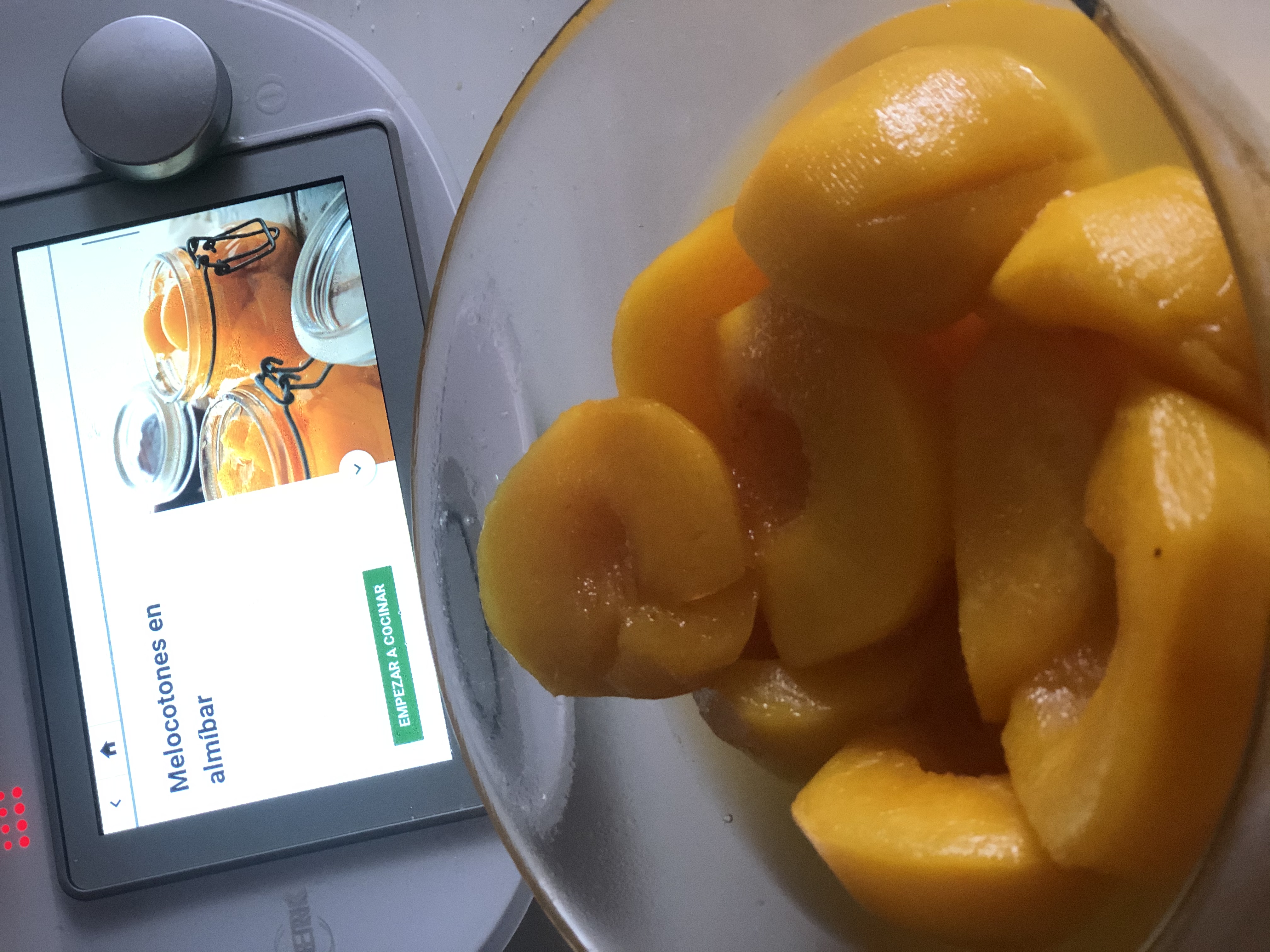 - Colocamos la mariposa en las cuchillas y ponemos los melocotones,el agua,el azucar,el zumo de limón y la sal.Programamos 15 minutos/Varoma/giro inverso/Vel cuchara.Ponemos los melocotones, aún en caliente en tarros esterilezados,cubrimos con el almibar y eejamos enfriar los tarros boca abajo.Tambien podemos ponerlos al baño Maria ( asi nos duraran mas tiempo) .En la nevera una vez realizados nos aguanta unos dias