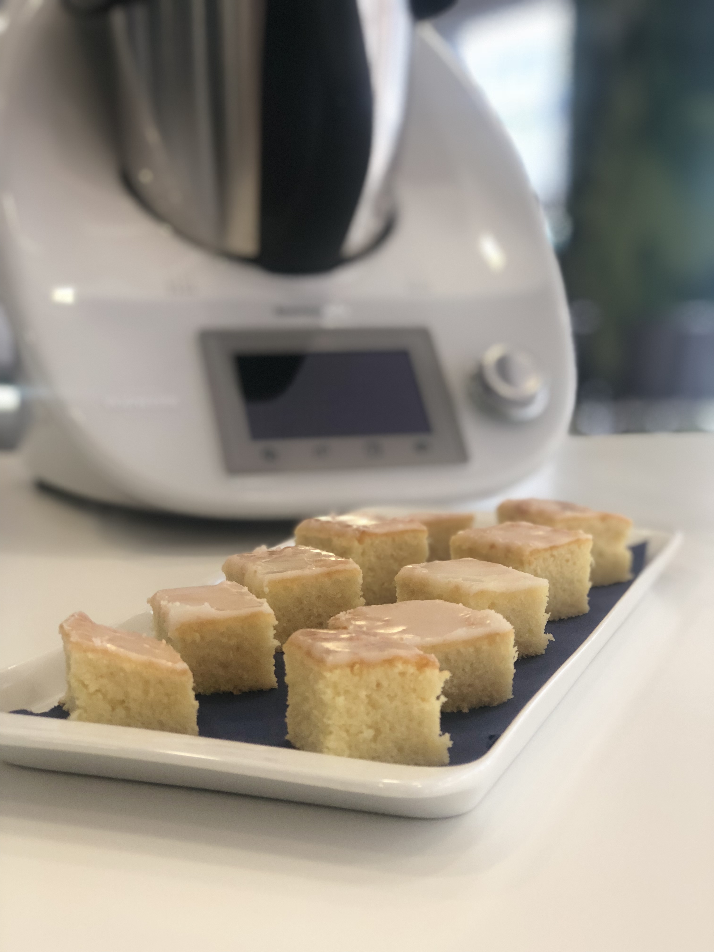 - Para la cobertura, ponemos en el vaso el azúcar glass con el zumo de limón y lo programas 5 m 80 grados vel 3 . Ponemos esra mezcla encima del bizcocho con la ayuda de un pincel , es importante que lo hagamos cuando el bizcocho está caliente todavía