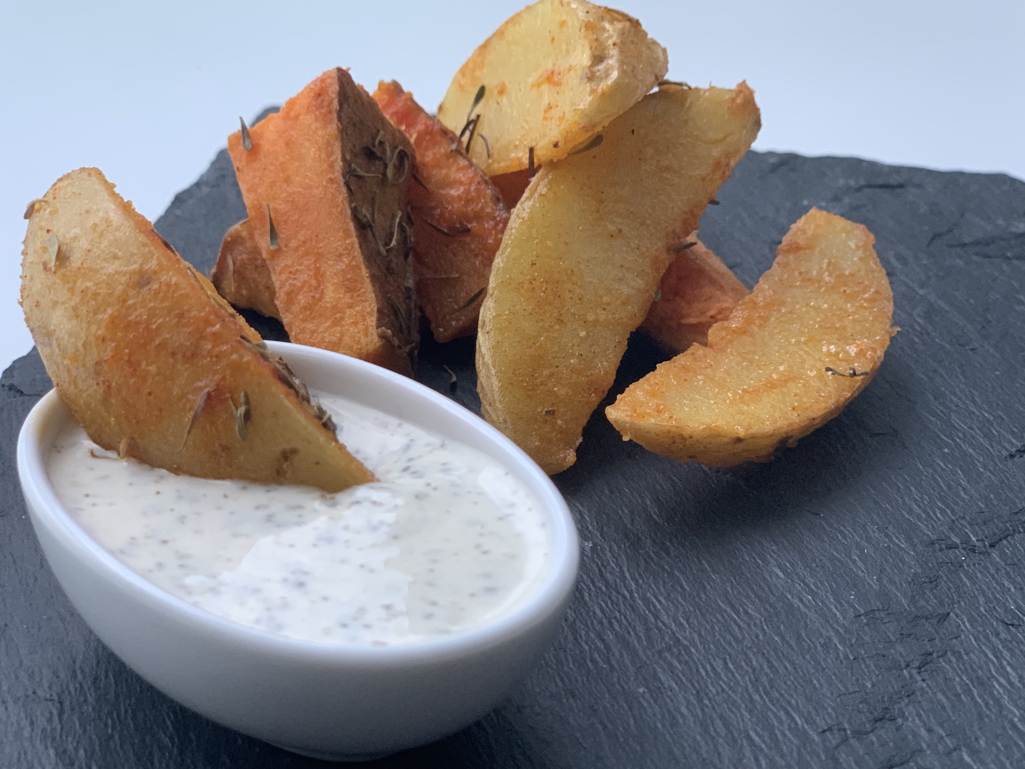 - En una bolsa (o en un bol), mezcle la harina, el pimentón, el ajo, el orégano, el tomillo, el estragón y la sal. Añada las patatas precocidas del cestillo, cierre la bolsa y mueva bien para rebozar las patatas.
