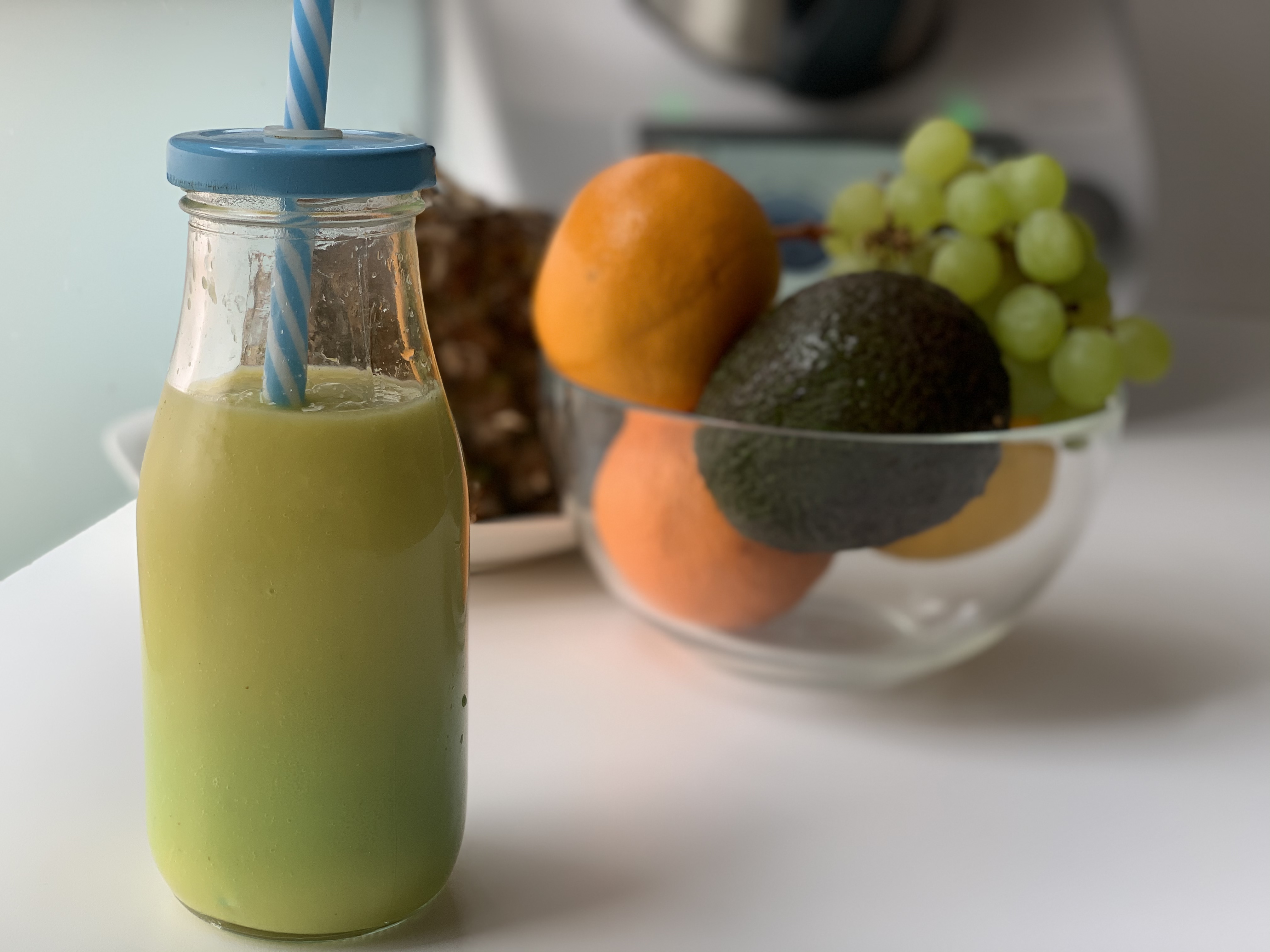 - Lavamos las uvas y separamos del racimo. Pelamos el aguacate, las naranjas sin parte blanca, cortamos la piña en trozos.