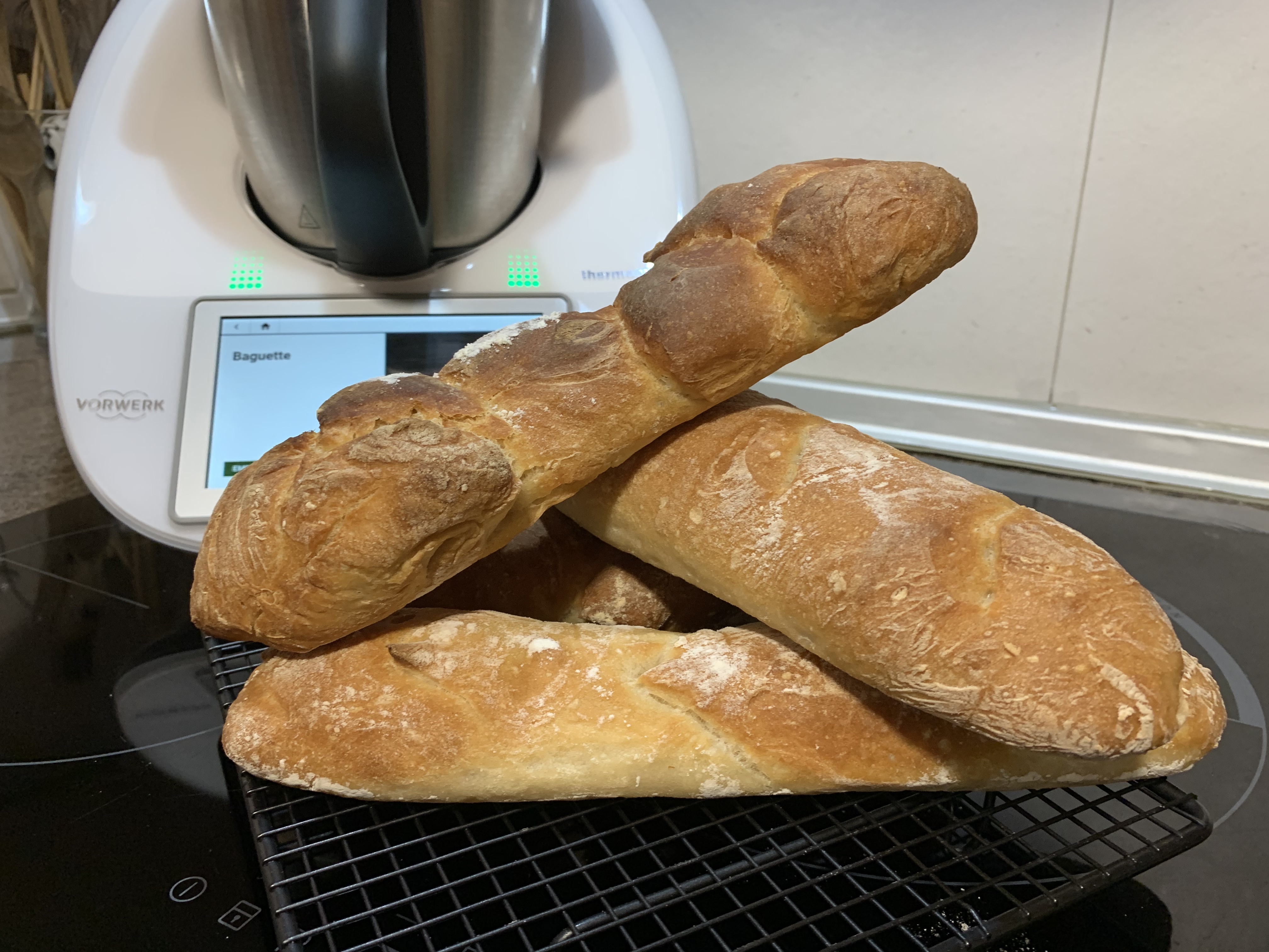 - Prepare aprox. 100 g de agua muy caliente en una taza. Con un cuchillo muy afilado, haga 3 cortes diagonales en la superficie de cada baguette. Deslice las baguettes, junto con el papel de hornear, sobre la bandeja precalentada situada más arriba. Rápidamente pero con cuidado, vierta el agua caliente sobre la bandeja que está debajo para crear vapor y cierre inmediatamente la puerta del horno para atraparlo. Hornee durante 20 minutos (250°C), o hasta que hayan tomado color dorado oscuro .Si las baguettes estuvieran ya bastante oscuras antes de terminar el tiempo de horneado, reduzca la temperatura del horno a 230°C. Deje enfriar las baguettes durante 20 minutos antes de cortarlas en rebanadas.