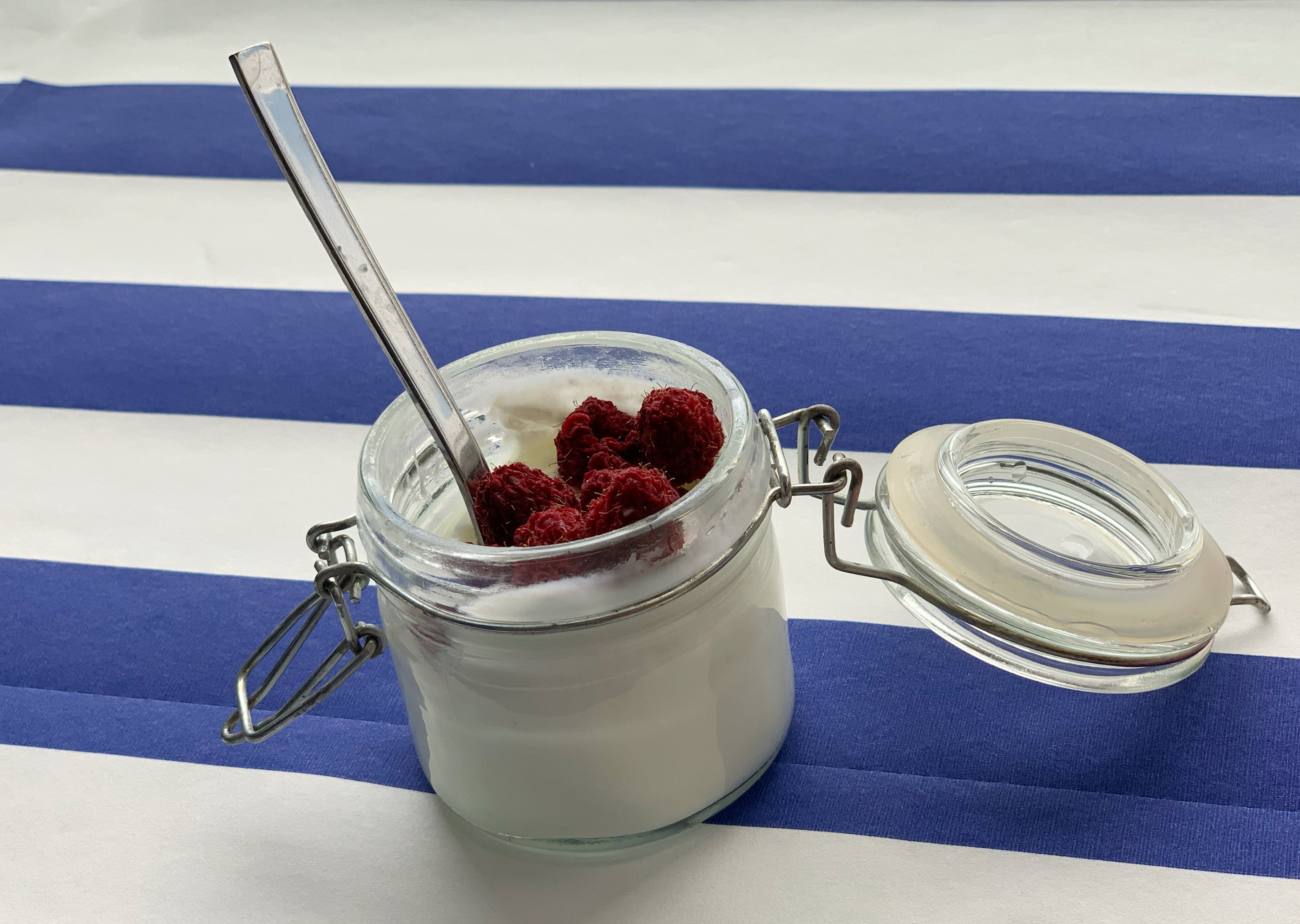 - Ponga en el vaso el agua y el ácido ascórbico (vitamina C en polvo) o el zumo de limón. Sitúe el Varoma tapado en su posición e inicie Fermentar /10 h/70°C (modelos anteriores cobrar el thermomix con una bolsa térmica). Retire el Varoma y ponga los tarros de yogur en el frigorífico. Refrigere al menos durante 2 horas antes de servir o conserve los yogures tapados en el frigorífico hasta 8 días.