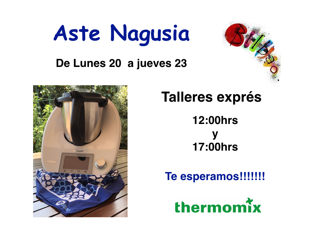 Aprovechando todas las actividades que tenemos en nuestra ciudad, Thermomix no podía ser menos. No te puedes perder los talleres exprés que haremos esta Semana Grande en Bilbao. Si quieres conocer la elaboración de algún dulce típico y ver como cocinamos a varios niveles con nuestro Thermomix....pásate por nuestra delegación (Plaza Euskadi nº9), ponte en contacto conmigo para que te reserve una plaza o más si vas a venir acompañad@.