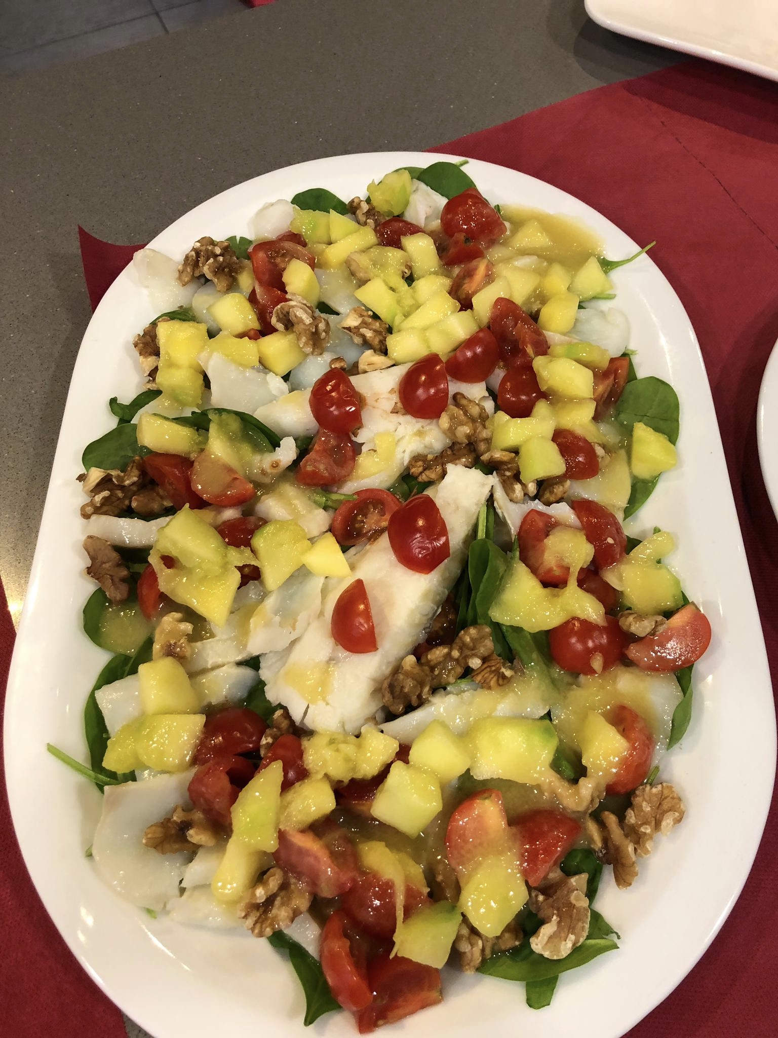 - Con ayuda de un cuchillo, corte la otra mitad del mango en bastones y mezcle con la vinagreta. Coloque los brotes de espinaca en una fuente y desmenuce el bacalao por encima. Añada los tomates cherry y las nueces, aliñe con la vinagreta y sirva.