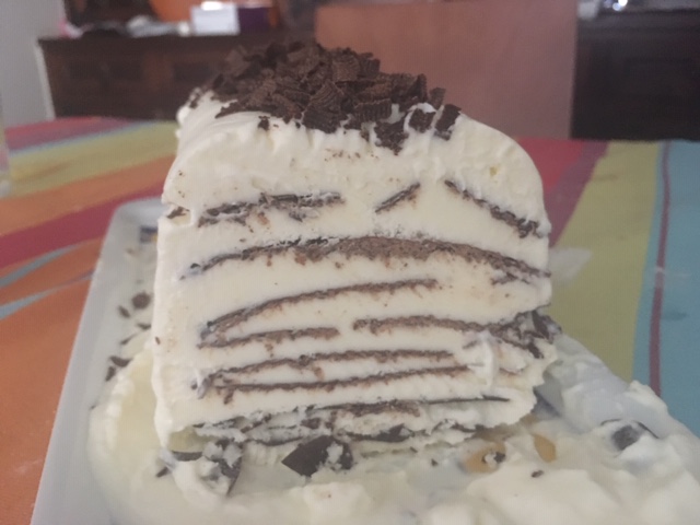 6. Ponga una capa de la mezcla de nata montada y merengue, cubra con una lámina de chocolate despegando el papel de horno y repita las capas hasta completar el molde, terminando con una capa de la mezcla. Cubra con film transparente y reserve en el congelador durante un mínimo de 8 horas.