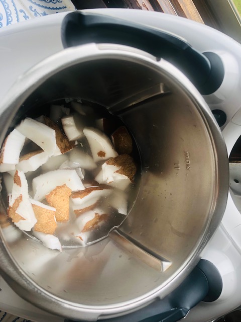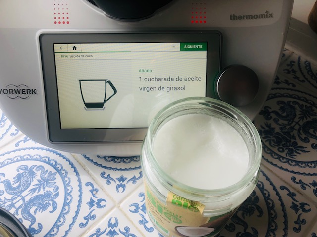 Añadir la pulpa del coco en pequeños trozos y el aceite de coco y triturar 1min/vel 5-10 progresivamente