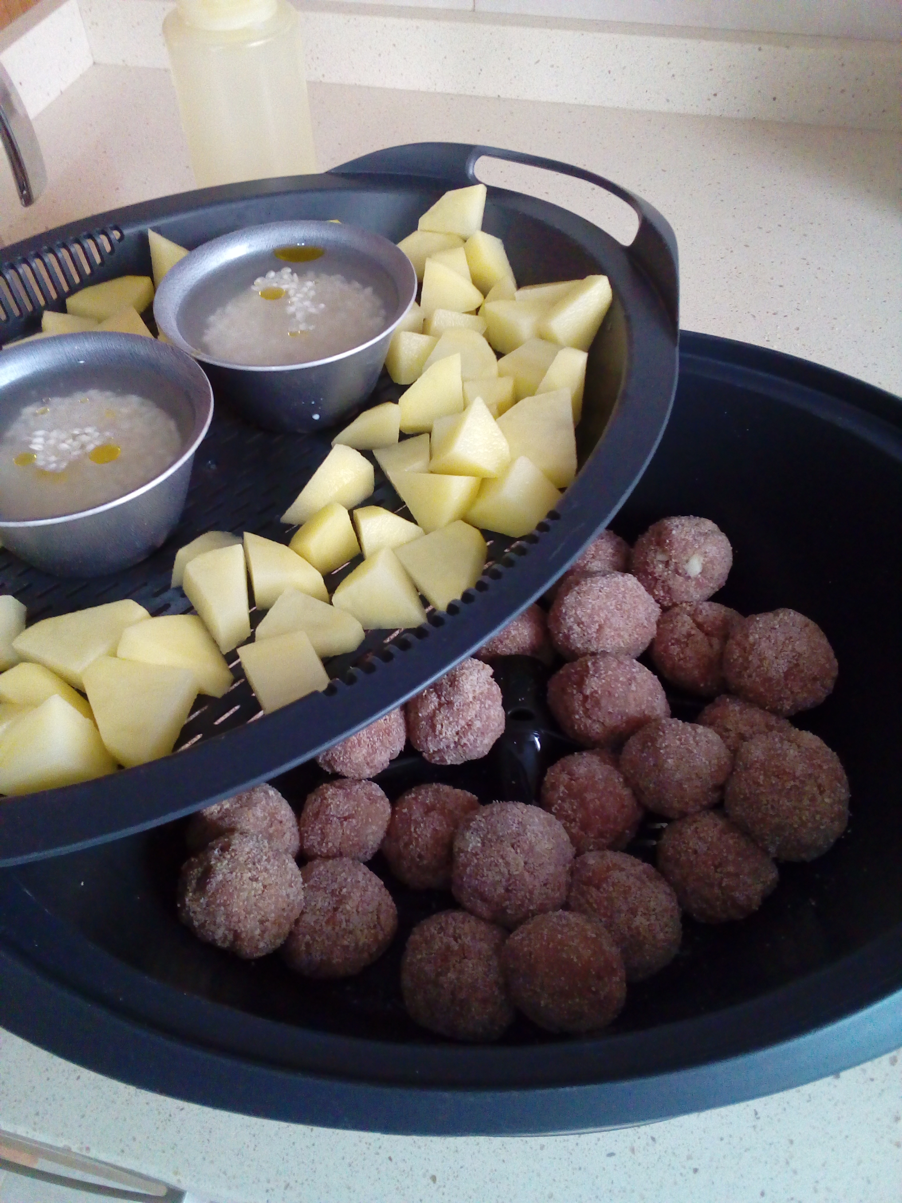 5.Pon la flanera en tu thermomix y pesa 30g de arroz por 50g. de agua , un poco de aceite y sal (para cada recipiente) corta las patatas y repartelas por los huecos que quedan entre las flaneras.