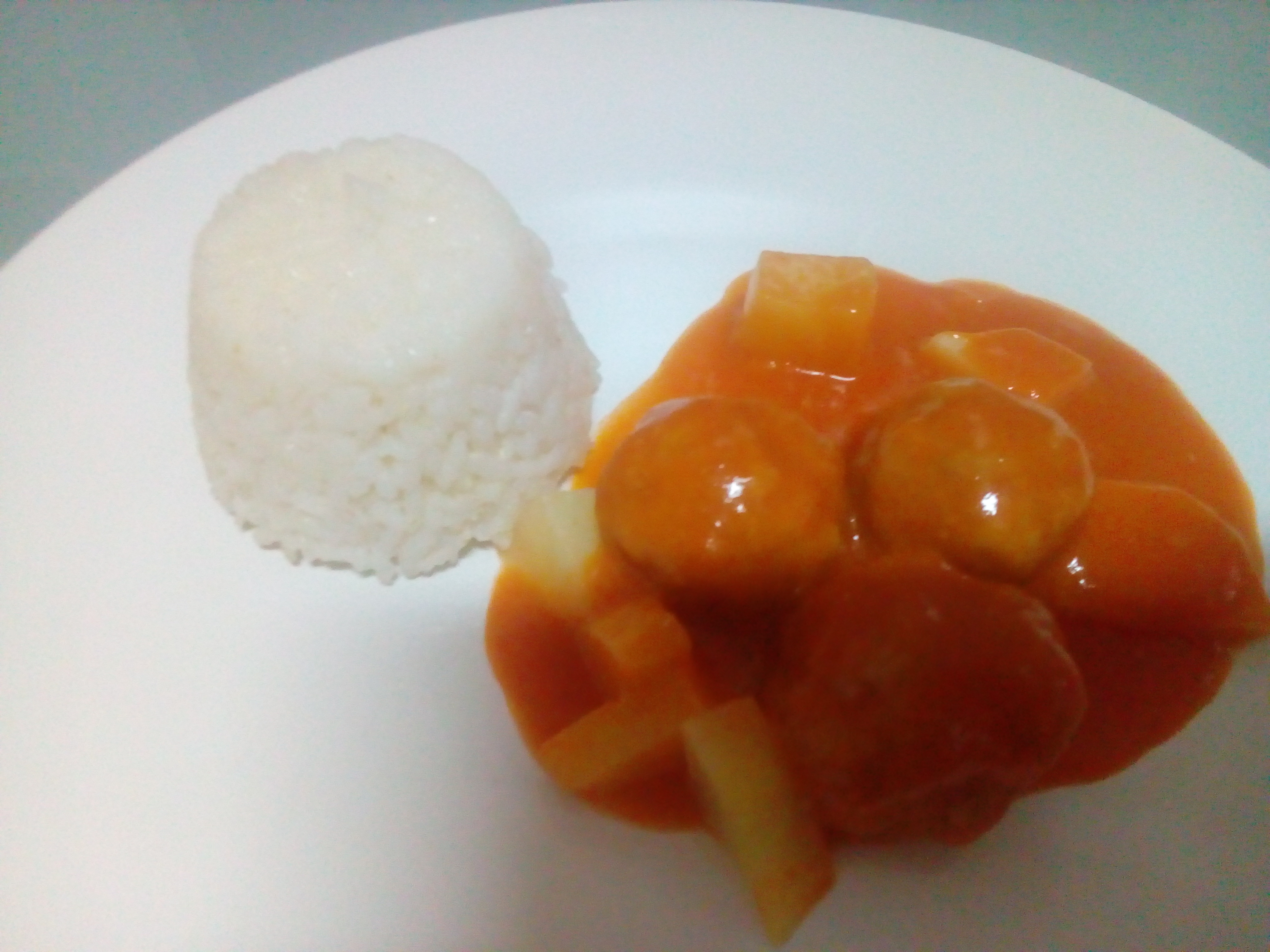 9.Sirve las albondigas con el arroz, las patatas y salsa de tomate.